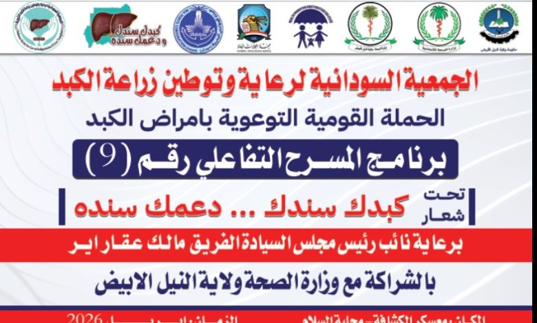 في إطار جهودها المستمرة لخلق بيئة صحية آمنة والاهتمام بصحة المواطنين .. أعلنت الجمعية السودانية لرعاية وتوطين زراعة الكبد عن انطلاق المرحلة الخامسة من الحملة القومية الكبرى للتوعية بأمراض الكبد غدآ الأربعاء بولاية النيل الأبيض.