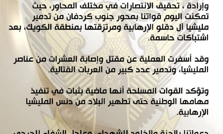 وتؤكد القوات المسلحة أنها ماضية بثبات في تنفيذ مهامها الوطنية حتى تطهير البلاد من دنس المليشيا الإرهابية.
