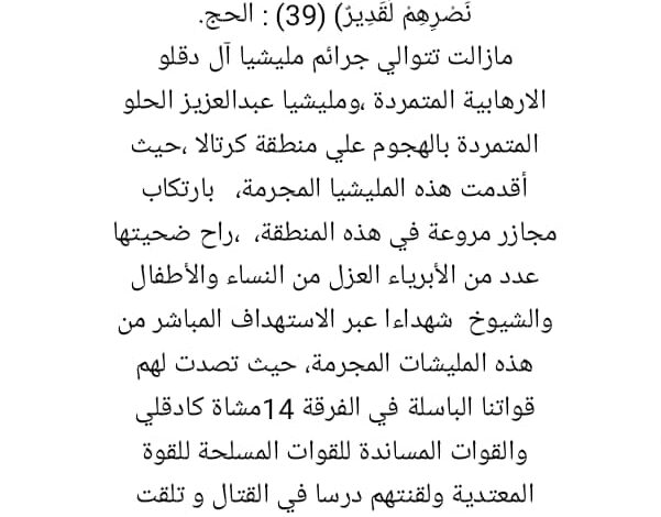 ان مهاجمة مليشيا آل دقلو الارهابية ومليشيا عبدالعزيز الحلو علي المواطنين العزل وارتكابهم ابشع الجرائم ضدالانسانية بحق هؤلاء الابرياء العزل يعد من ابشع واقبح الجرائم المتكررة اعتادت علي ارتكابها هذه المليشيات المجرمة والمتمردة في منطقة كرتالا.