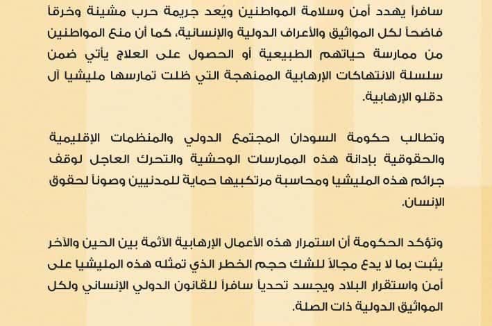 وتطالب حكومة السودان المجتمع الدولي والمنظمات الإقليمية والحقوقية بإدانة هذه الممارسات الوحشية والتحرك العاجل لوقف جرائم هذه المليشيا ومحاسبة مرتكبيها حمايةً للمدنيين وصوناً لحقوق الإنسان.