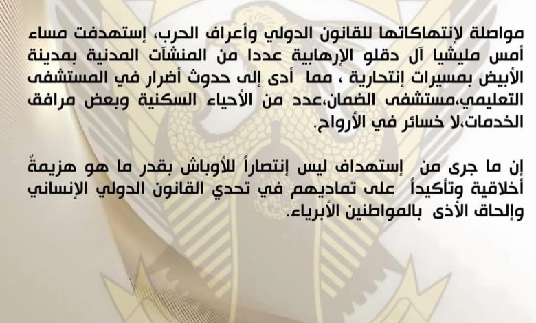 مواصلة لإنتهاكاتها للقانون الدولي وأعراف الحرب، إستهدفت مساء أمس مليشيا آل دقلو الإرهابية عددا من المنشآت المدنية بمدينة الأبيض بمسيرات إنتحارية ، مما أدى إلى حدوث أضرار في المستشفى التعليمي، مستشفى الضمان، عدد من الأحياء السكنية وبعض مرافق الخدمات، لا خسائر في الأرواح.