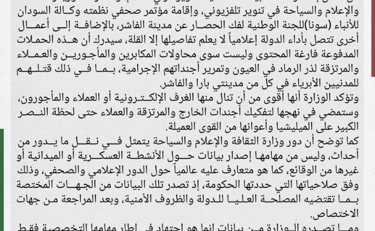 غير أن الناظر المنصف لما قامت به الوزارة من حيوية ونشاط — يوم أمس فقط — من خلال إصدار خمسة بيانات متتالية لتنوير الرأي العام، ومشاركة وزير الثقافة والإعلام والسياحة في تنوير تلفزيوني، وإقامة مؤتمر صحفي نظمته وكالة السودان للأنباء (سونا)للجنة الوطنية لفك الحصار عن مدينة الفاشر، بالإضافة إلى أعمال أخرى تتصل بأداء الدولة إعلامياً لا يعلم تفاصيلها إلا القلة، سيدرك أن هذه الحملات المدفوعة فارغة المحتوى وليست سوى محاولات المكابرين والمأجورين والعملاء والمرتزقة لذر الرماد في العيون وتمرير أجنداتهم الإجرامية، بما في ذلك قتلهم للمدنيين الأبرياء في كل من مدينتي بارا والفاشر.