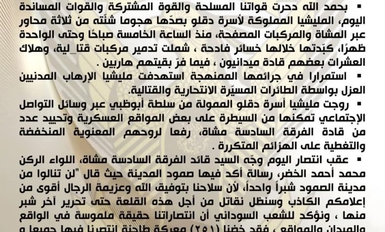 ▪︎ عقب انتصار اليوم وجّه السيد قائد الفرقة السادسة مشاة، اللواء الركن محمد أحمد الخضر، رسالة أكد فيها صمود المدينة حيث قال “لن تنالوا من مدينة الصمود شبراً واحداً، لأن سلاحنا بتوفيق الله وعزيمة الرجال أقوى من إعلامكم الكاذب وسنظل نقاتل من أجل هذه القلعة حتى تحرير آخر شبر منها ، ونؤكد للشعب السوداني أن انتصاراتنا حقيقة ملموسة فقد خضنا (٢٥١) معركة انتصرنا فيها جميعا و ماضون على درب النضال يدا واحدة جيش وقوات مشتركة و نظامية أخرى ومستنفرين حتى فكّ الحصار وتحرير كل شبر في دارفور من دنس المليشيا “.